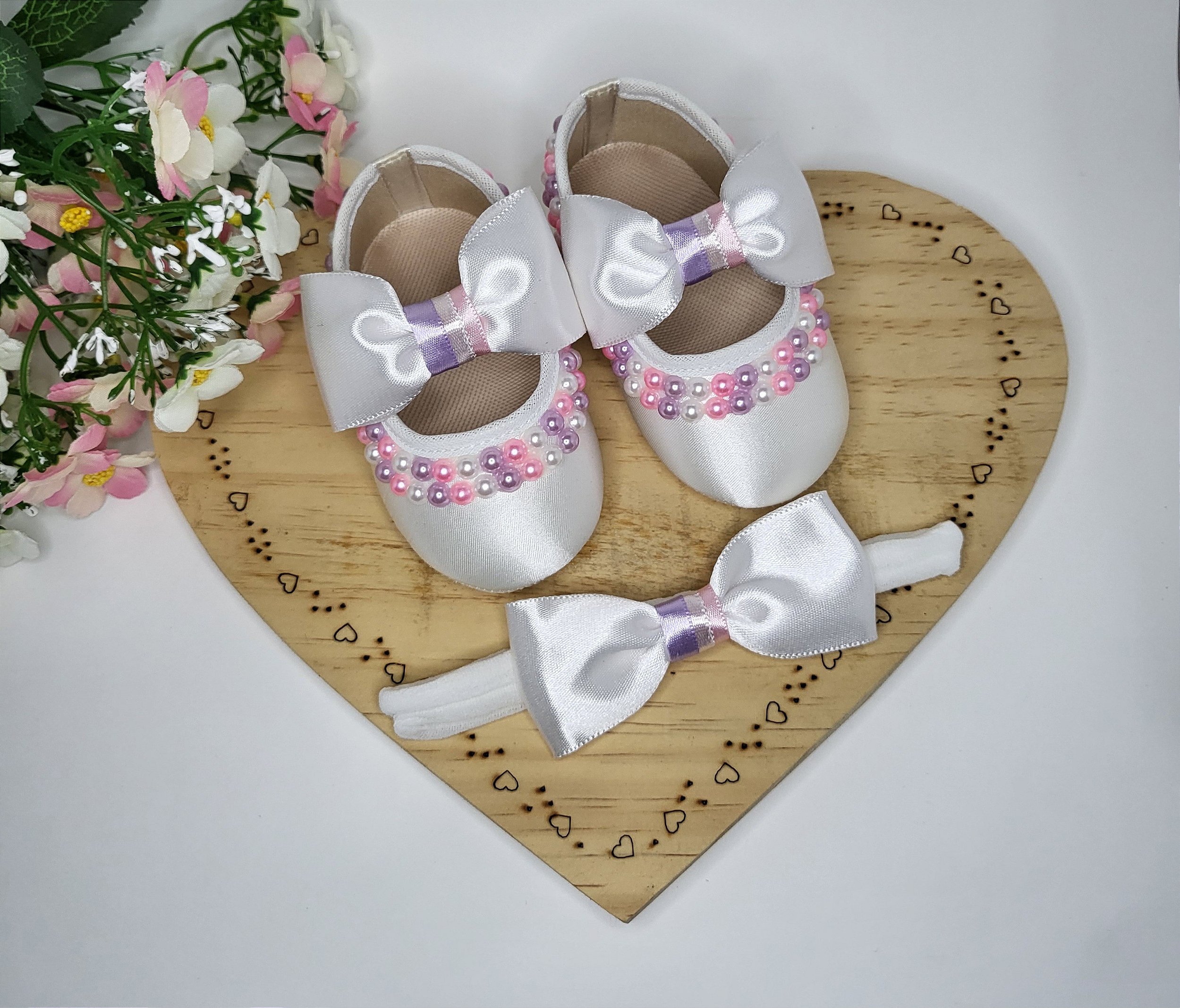 Kit Sapatinho e faixa de cabelo cor branca com detalhes em rosa e lilás.