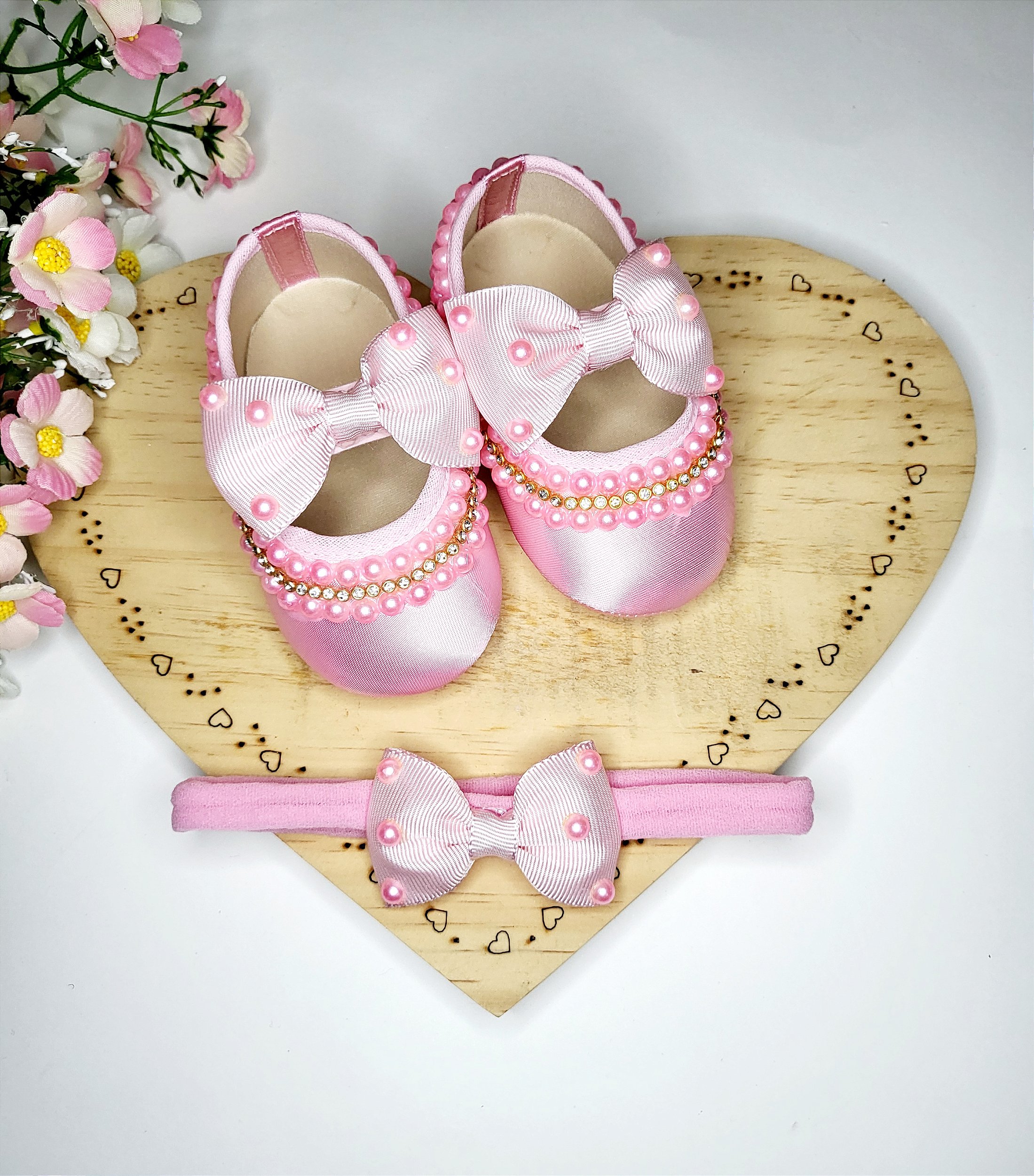 Kit composto por sapatinho revestido em cetim decorado e faixinha de cabelo.