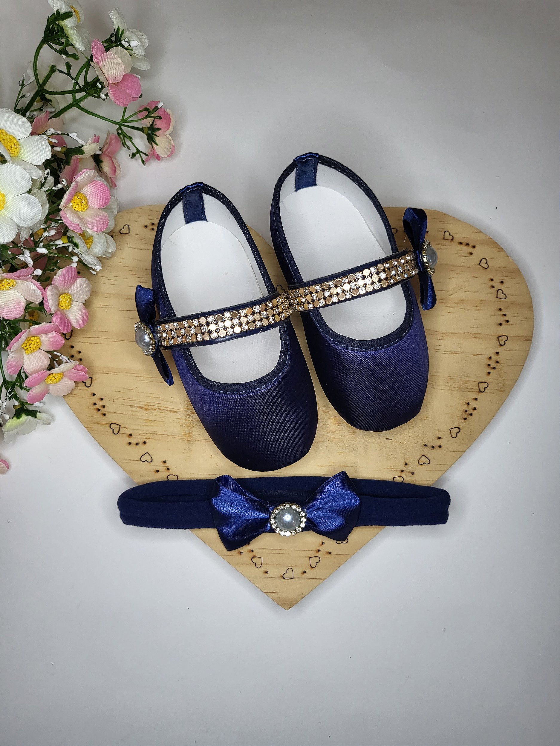 Kit composto por sapatinho revestido em cetim decorado e faixinha de cabelo.
