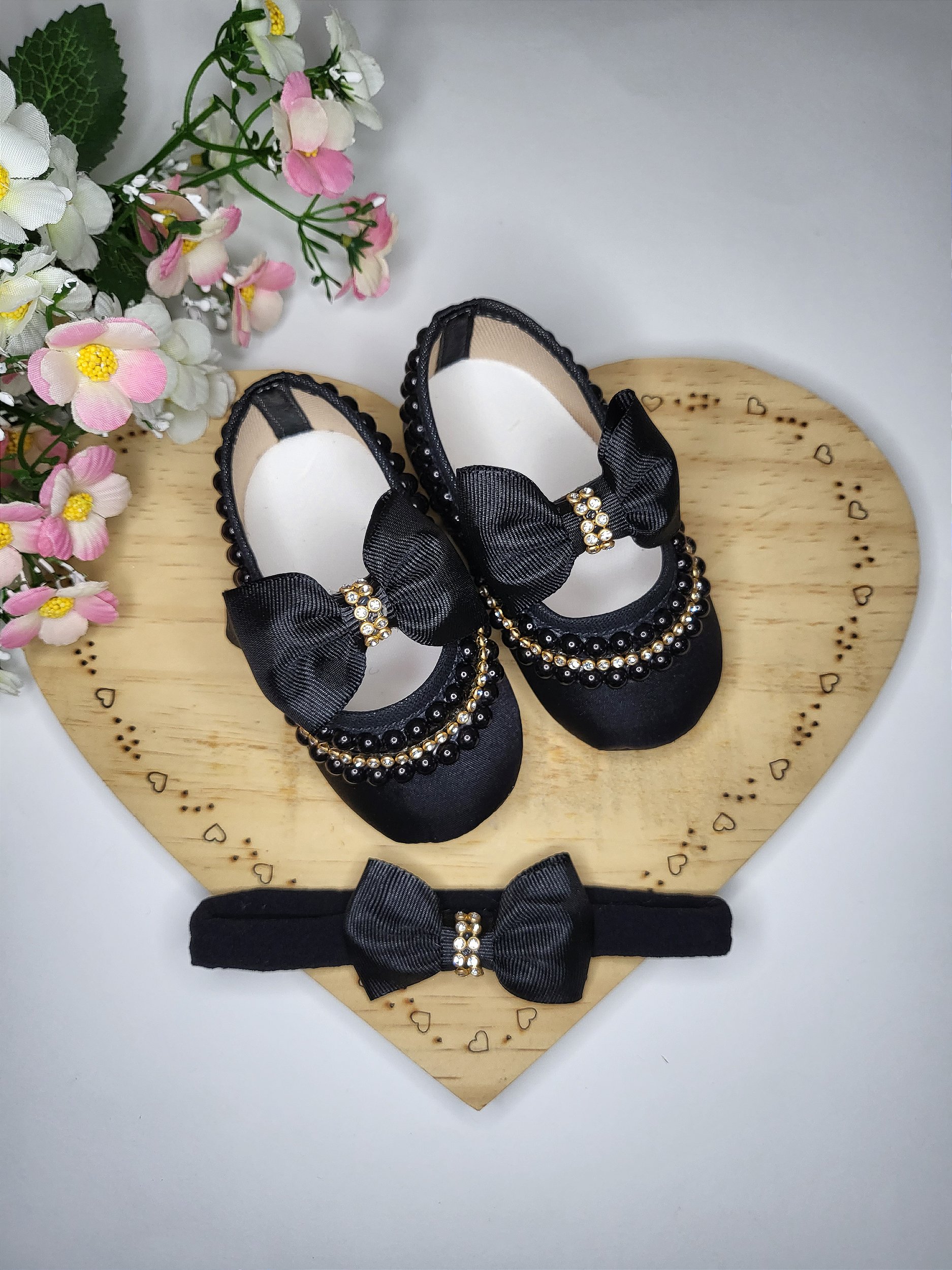 Kit composto por sapatinho revestido em cetim decorado e faixinha de cabelo.