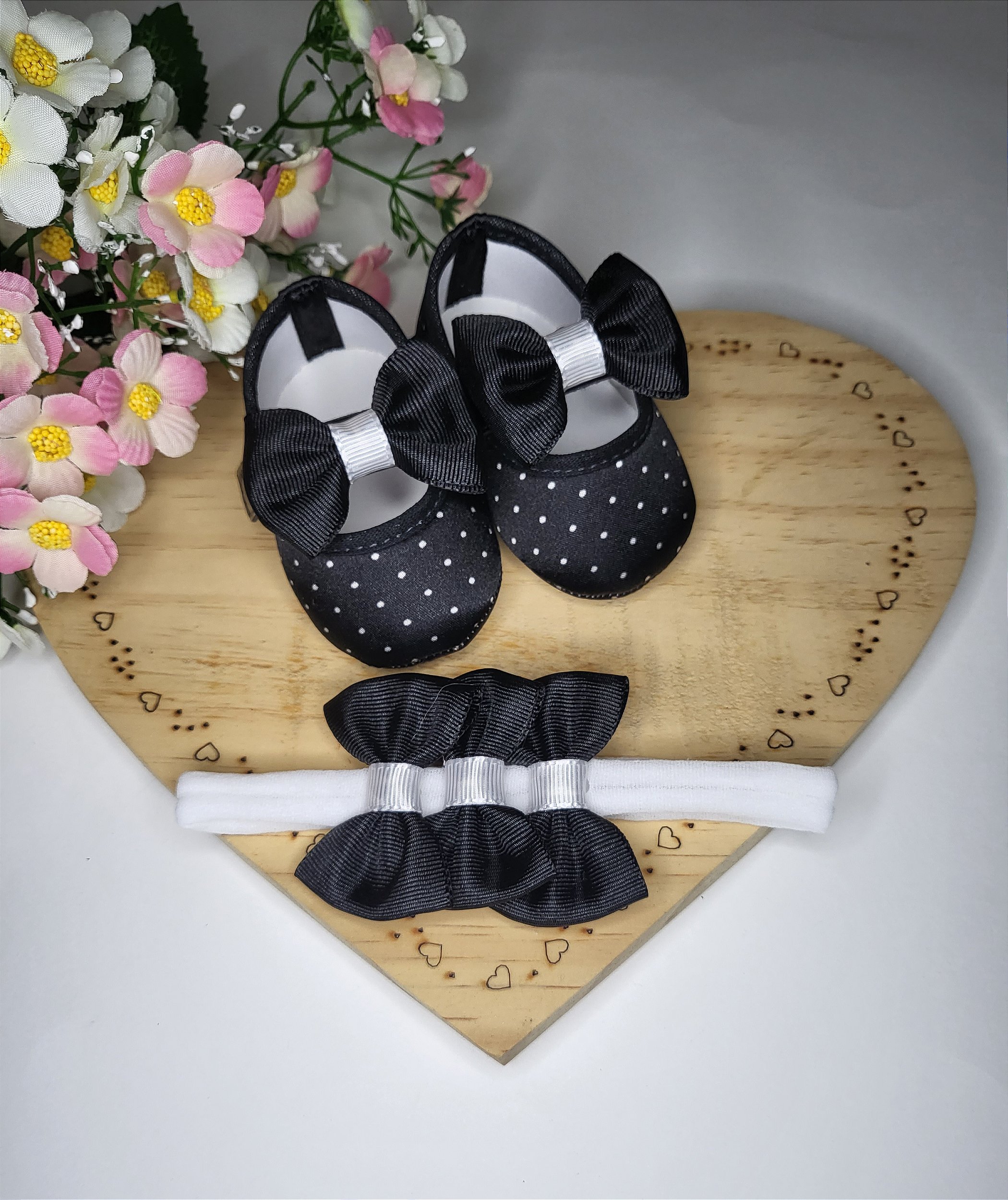 Kit composto por sapatinho revestido em cetim decorado e faixinha de cabelo.