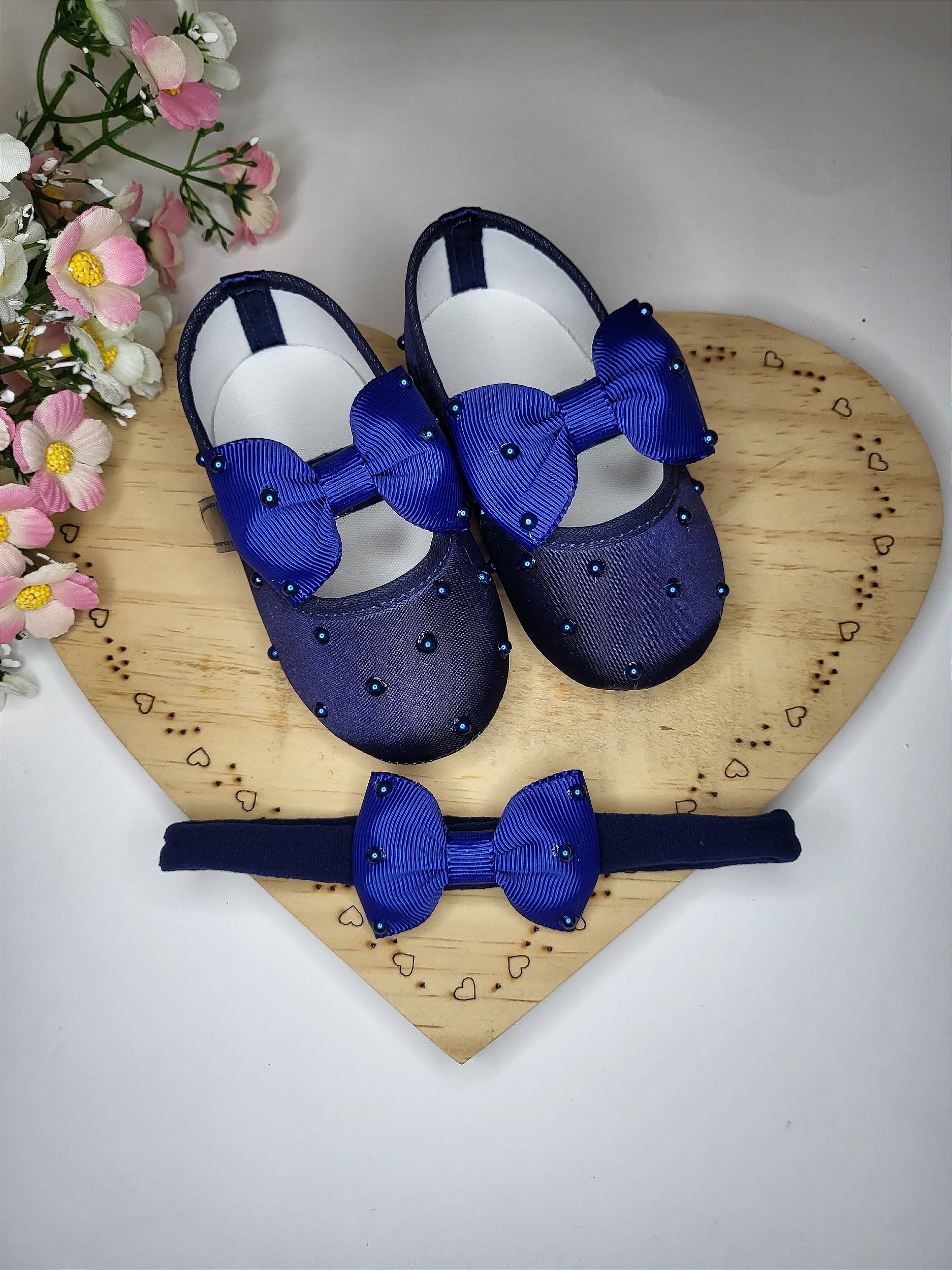 Kit composto por sapatinho revestido em cetim decorado e faixinha de cabelo.