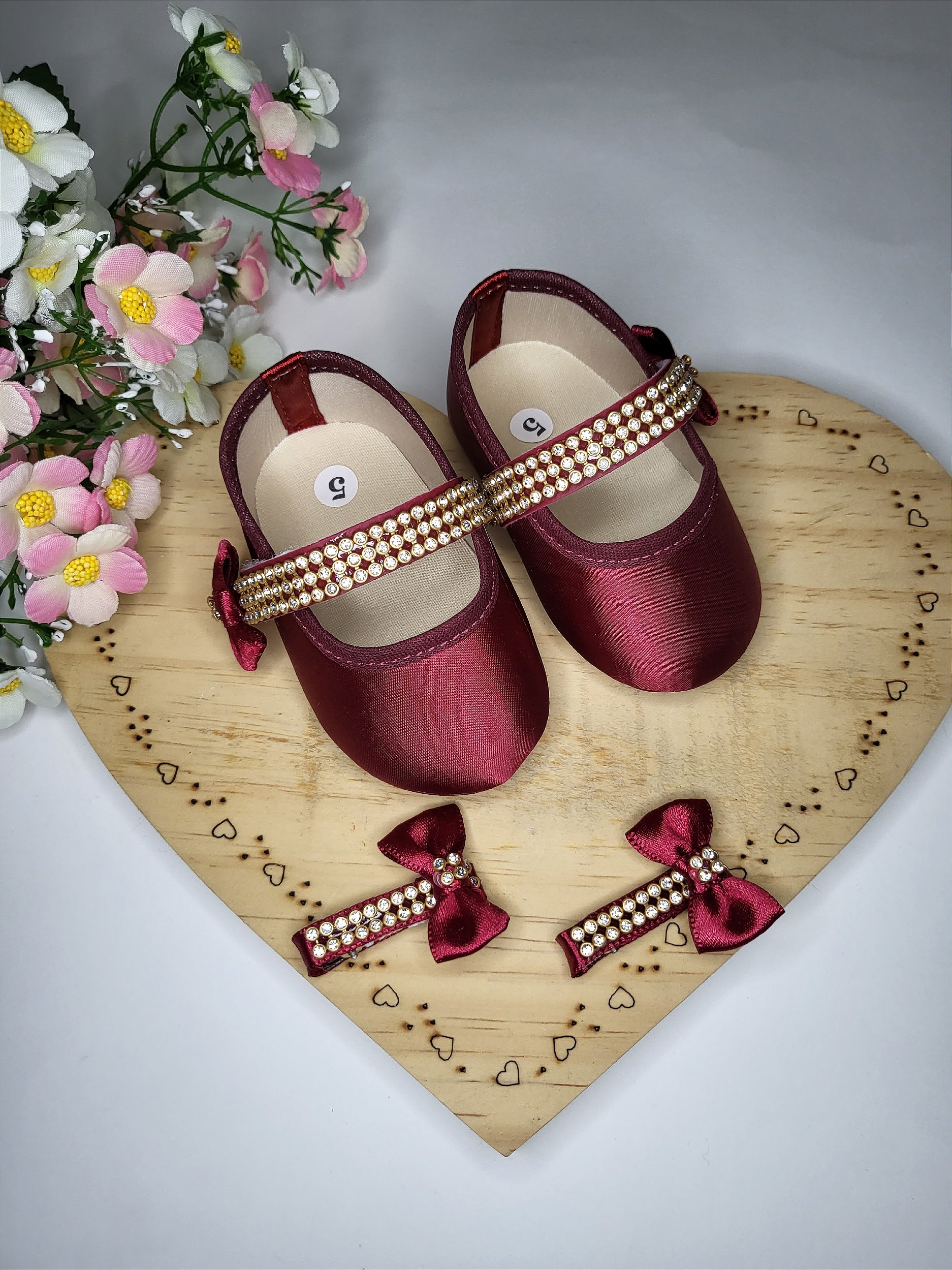 Kit composto por sapatinho revestido em cetim decorado e duas presilhas de cabelo com antiderrapante.