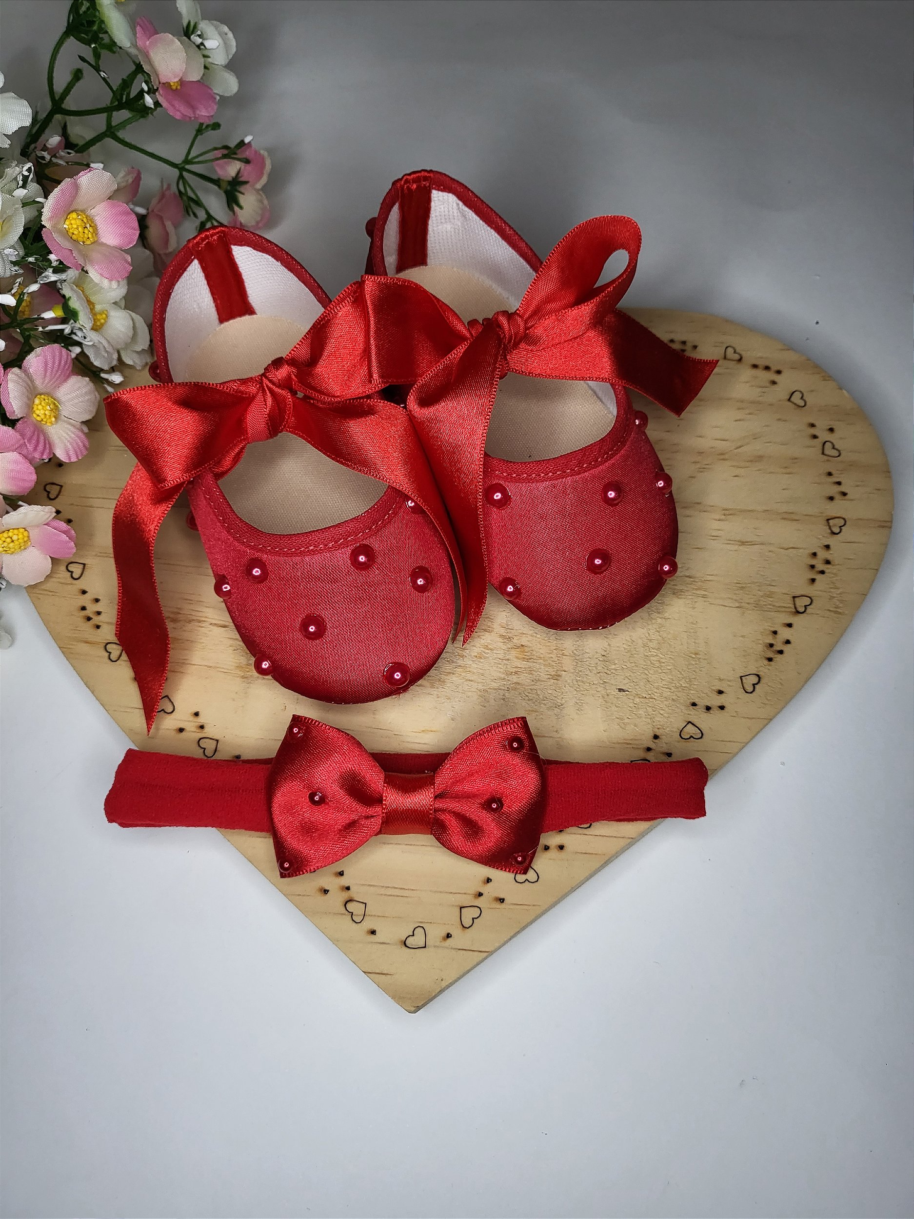 Kit composto por sapatinho revestido em cetim decorado e faixinha de cabelo.