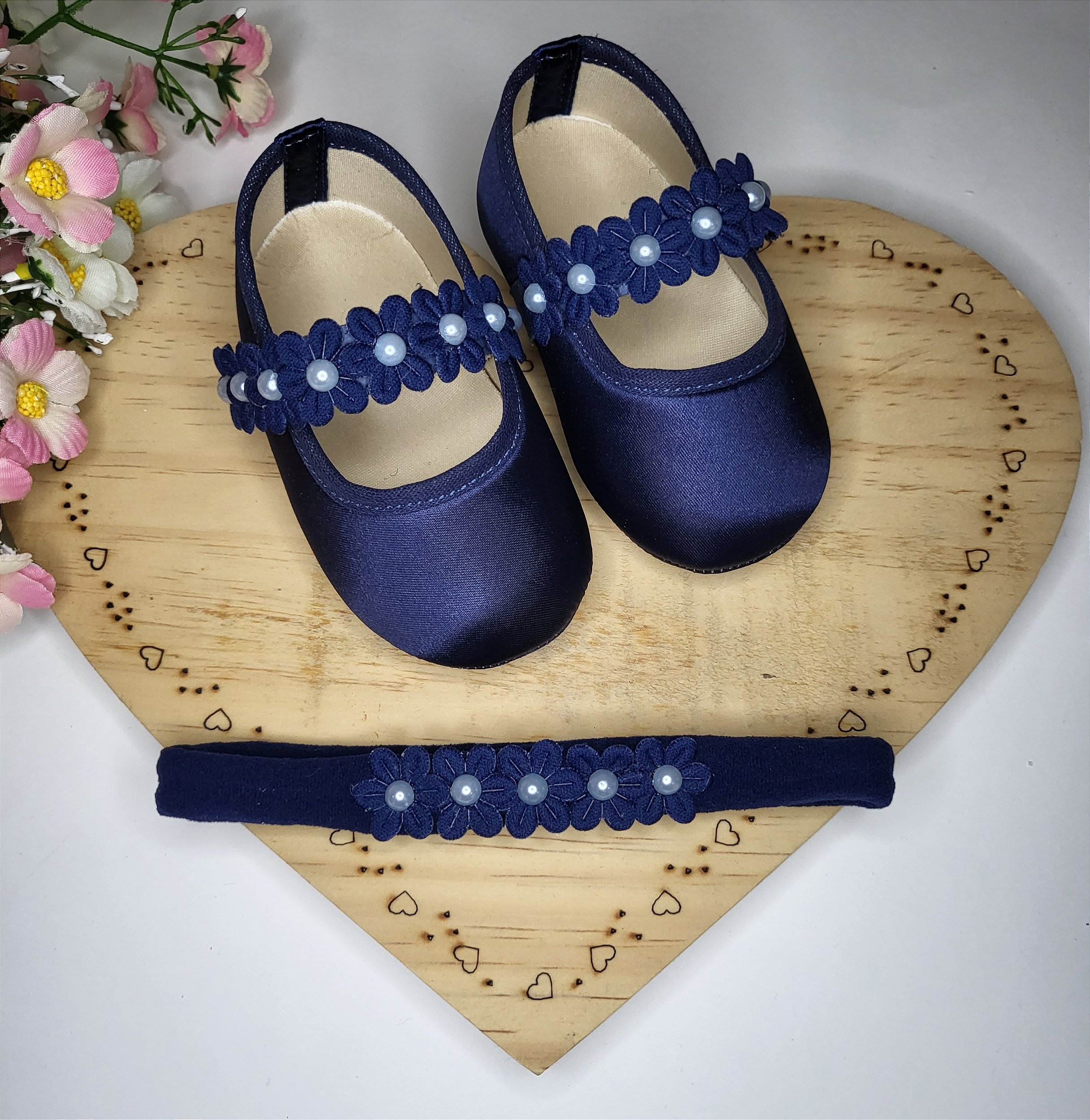 Kit composto por sapatinho revestido em cetim decorado e faixinha de cabelo.