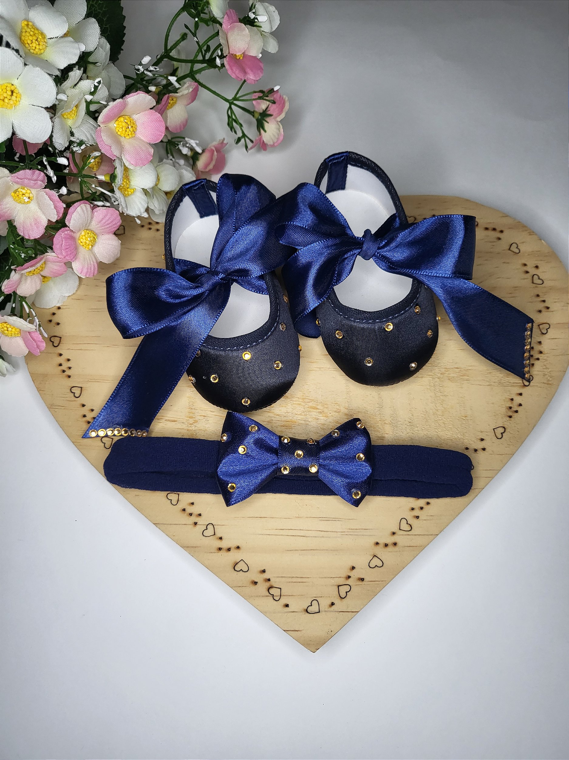 Kit composto por sapatinho revestido em cetim decorado e faixinha de cabelo.