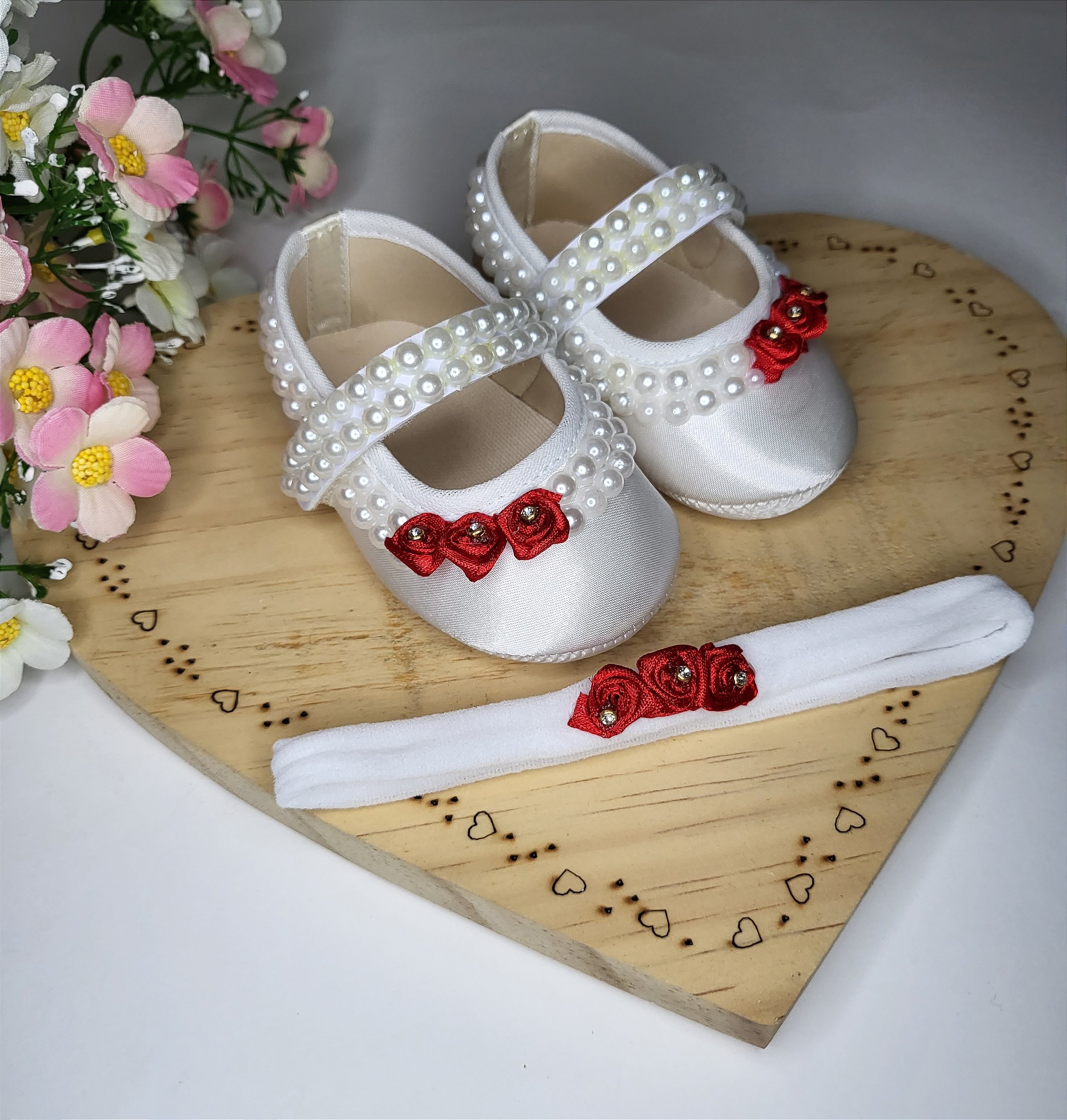 Kit composto por sapatinho revestido em cetim decorado e faixinha de cabelo.