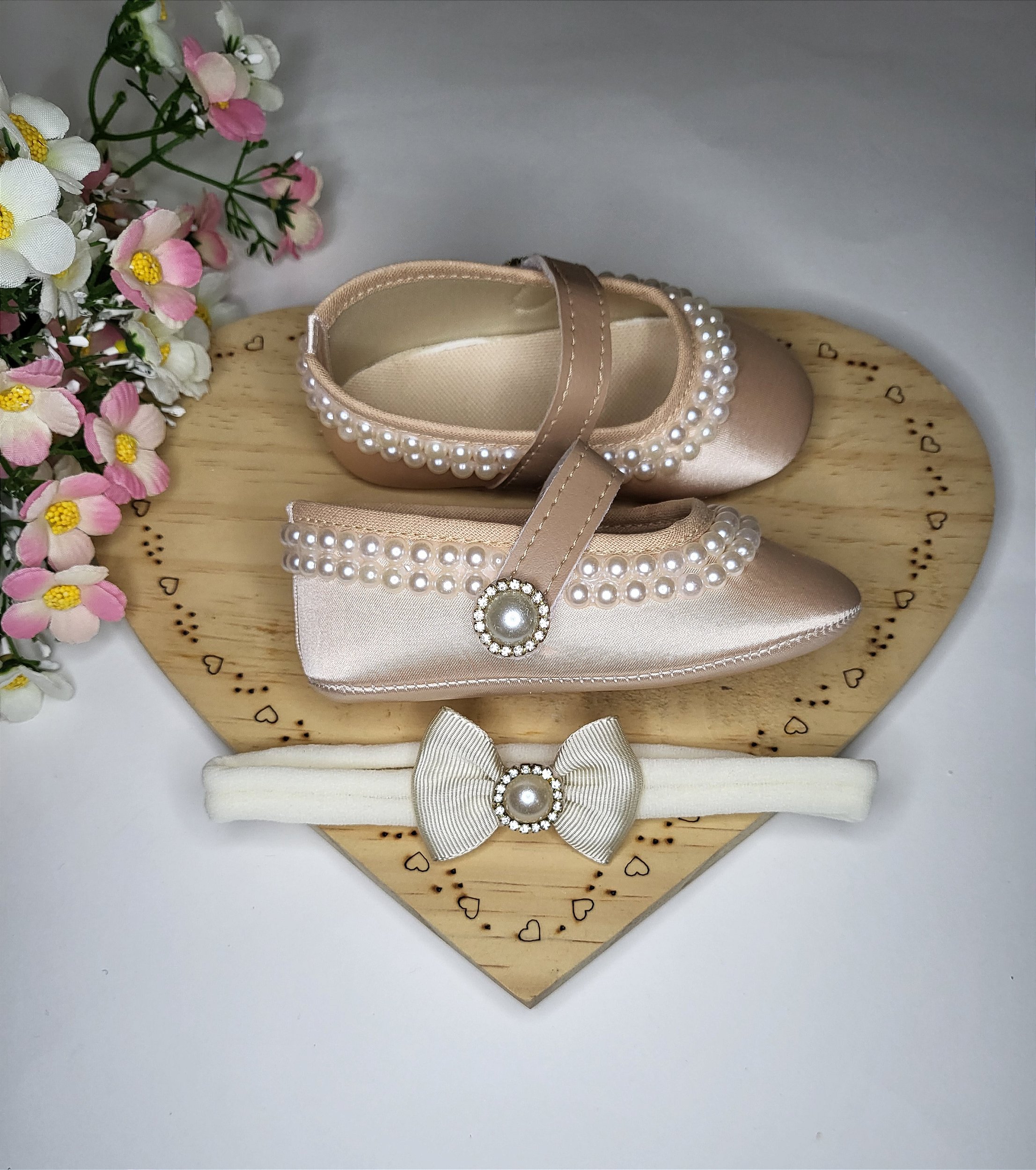 Kit composto por sapatinho revestido em cetim decorado e faixinha de cabelo.