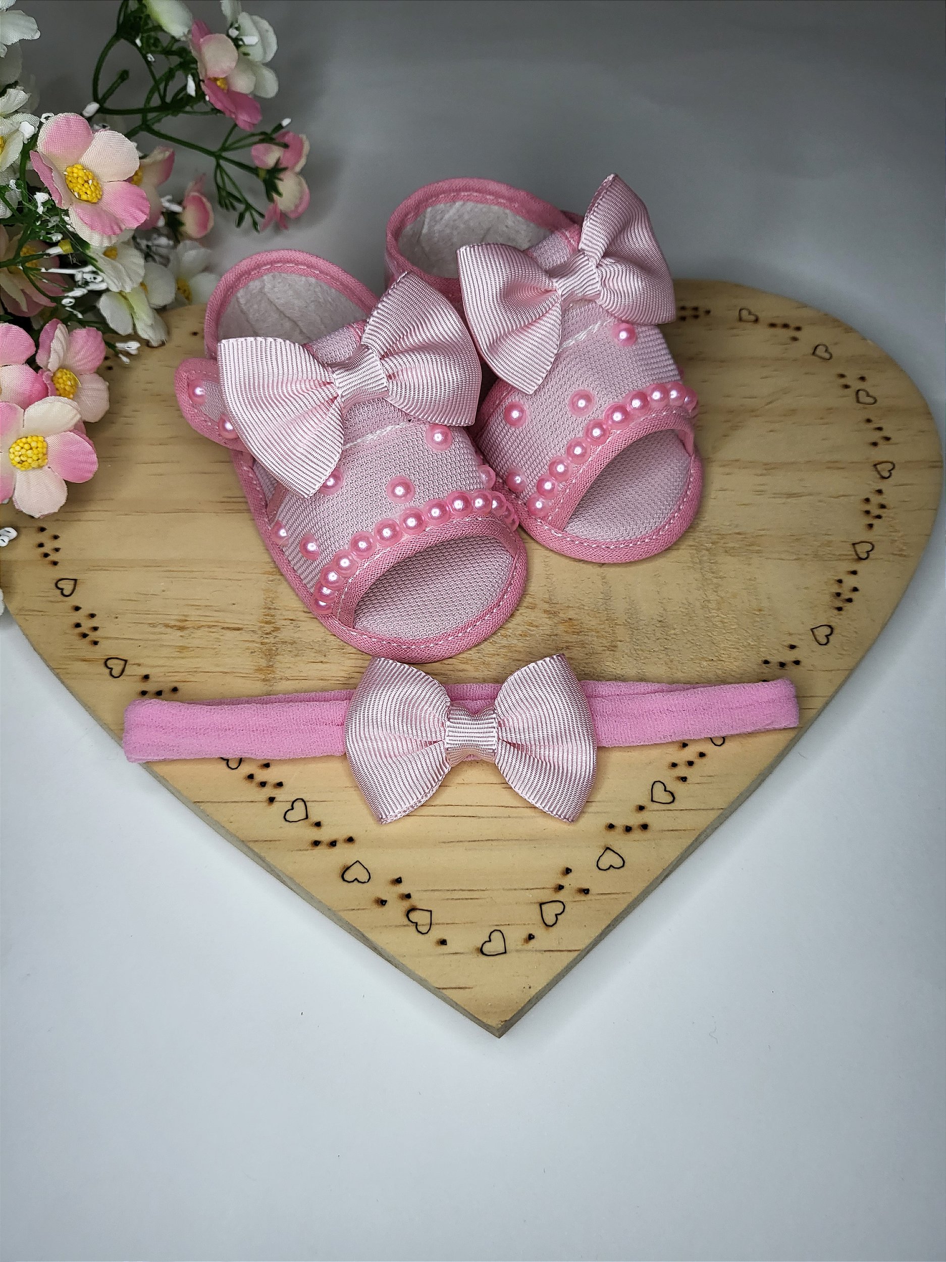 Kit composto por sandália decorada e faixinha de cabelo.