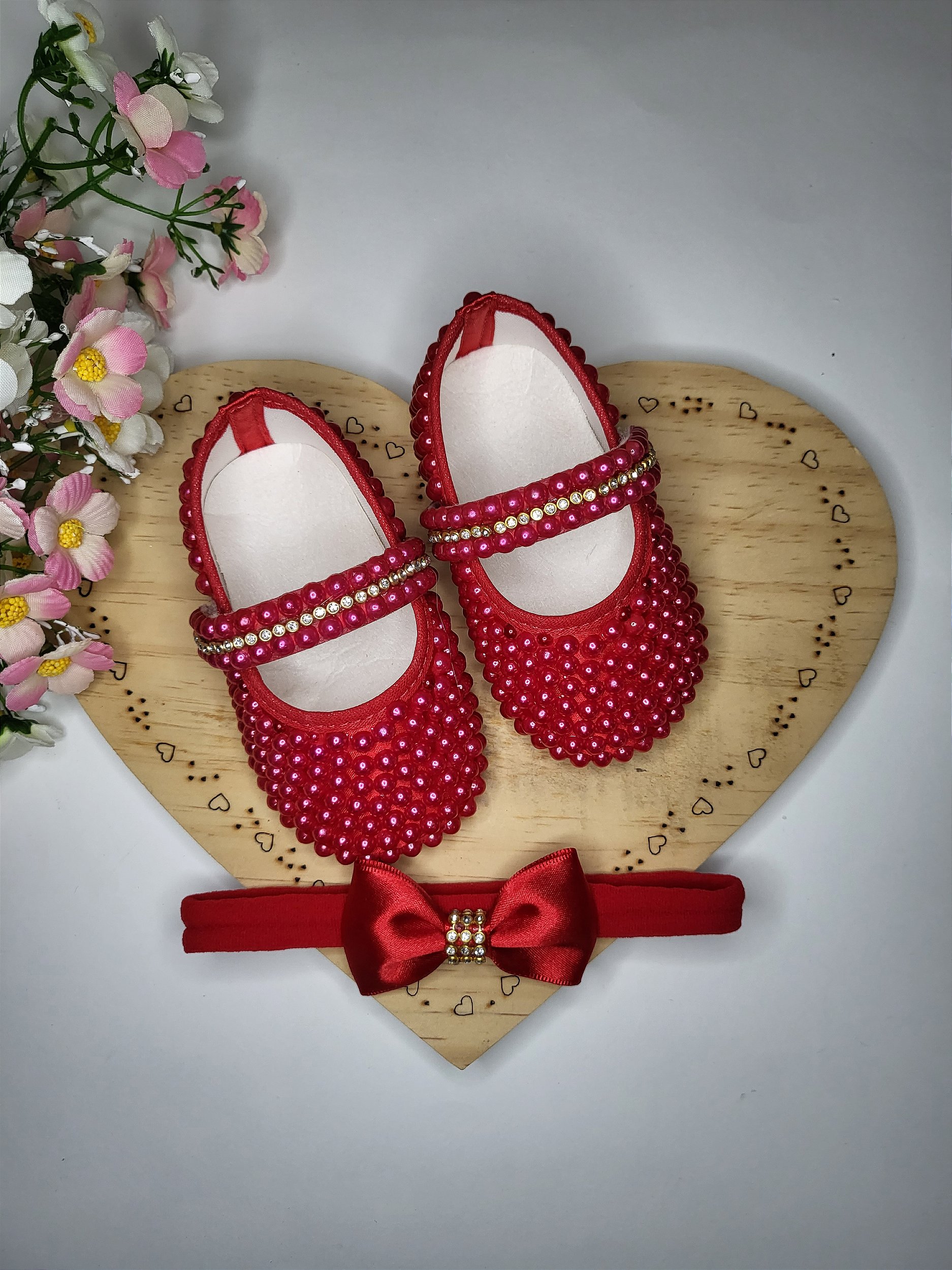 Kit composto por sapatinho revestido em cetim decorado e faixinha de cabelo.
